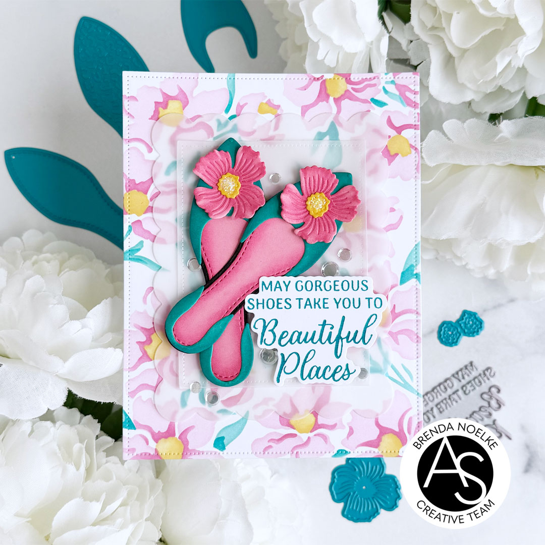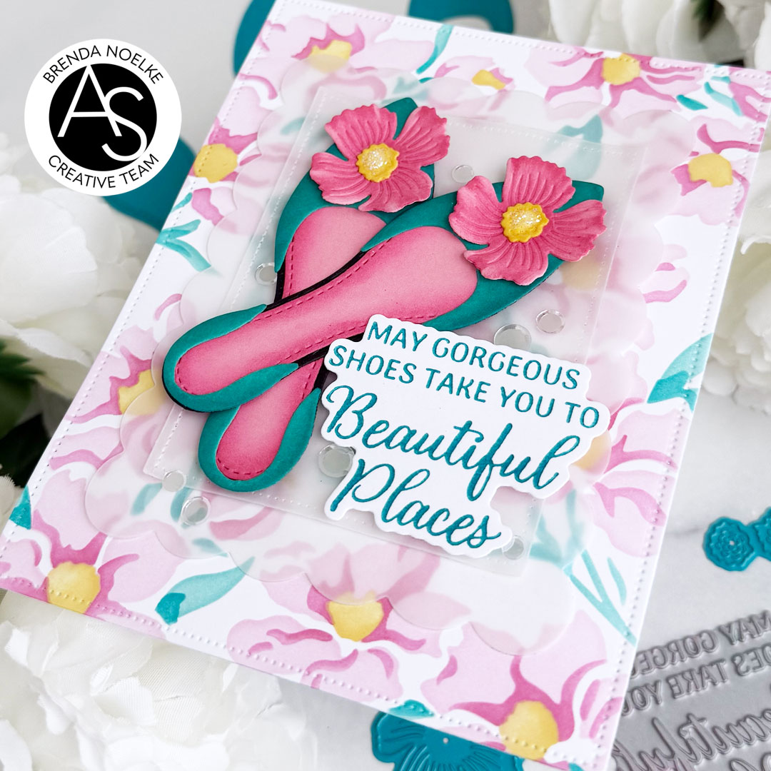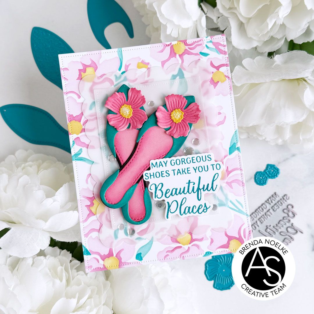 The sentiment, from the Shoes Sentiments Press Plate & Die Set, was pressed onto white cardstock with teal dye ink using the BetterPress System, then cut out with the included die. The shoes and sentiment were both popped up onto the vellum with foam squares. The vellum panels were adhered to the background, adding liquid glue only behind the die-cuts. I sprinkled on some clear confetti and added Star Dust Stickles to the centers of the flowers to add a bit of sparkle and shine and finish off the card.