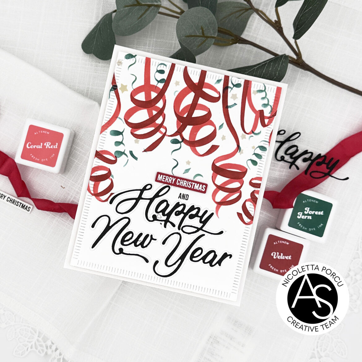 At that point I only add the sentiment to finish my card: I used the Happy New year die set, and the Christmas sentiments stamp set and the coordinate dies for the red Merry Christmas string .