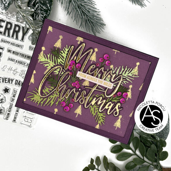 Next up I die cut the “Large Merry Christmas” die. a The bottom part of darker shade of a purple cardstock in 3 layers and the top from a metallic gold cardstock. I assembled everything and I put the big sentiment over the foliage,