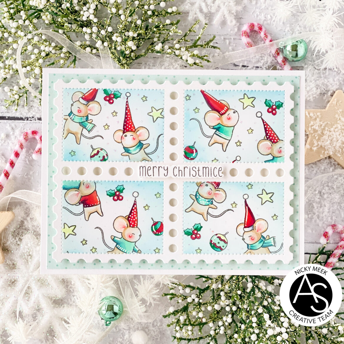 Hello! This is Nicky with you today on the Alex Syberia Designs blog and I’m sharing a new postage style Christmas card that I created using the adorable Merry Christmice stamp set together with it’s coordinating die. This card also uses the Postage Stamps Cover Die and Postage Stamps Stencil.