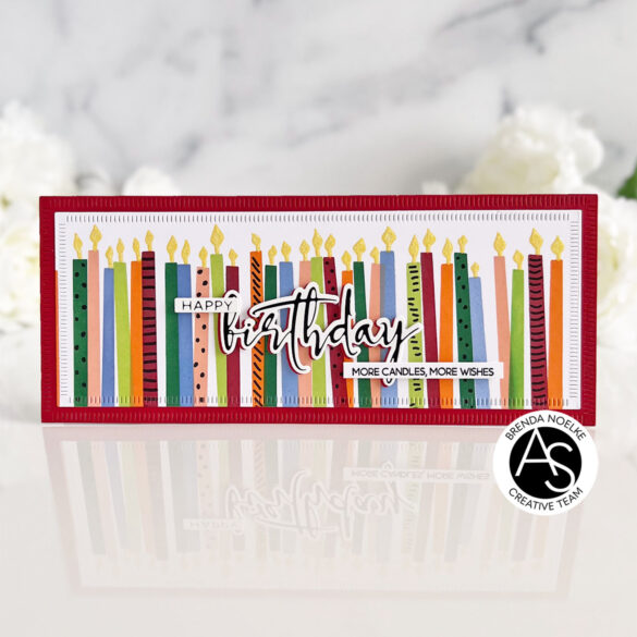 For the sentiment, I foiled “happy birthday” onto Glimmer specialty cardstock with matte black foil using the Birthday & Wish Hot Foil Plate Set. I cut it out with the Coordinating Die, along with another from plain red cardstock and two layers from heavyweight white cardstock. They were layered and adhered together, slightly offset, then popped up with foam tape.