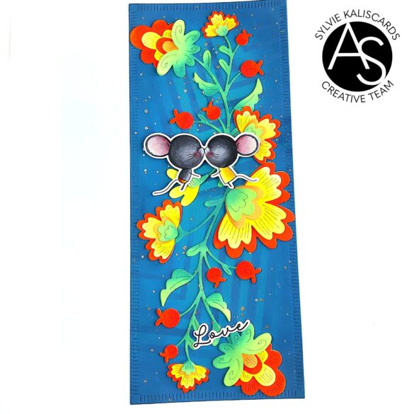I then adhered the petals and leaves onto the stems. I glued the sentiment at the bottom, to hide more of the glue mess on the stem. And finally I adhered the mice with foam tape where the two stems connect.