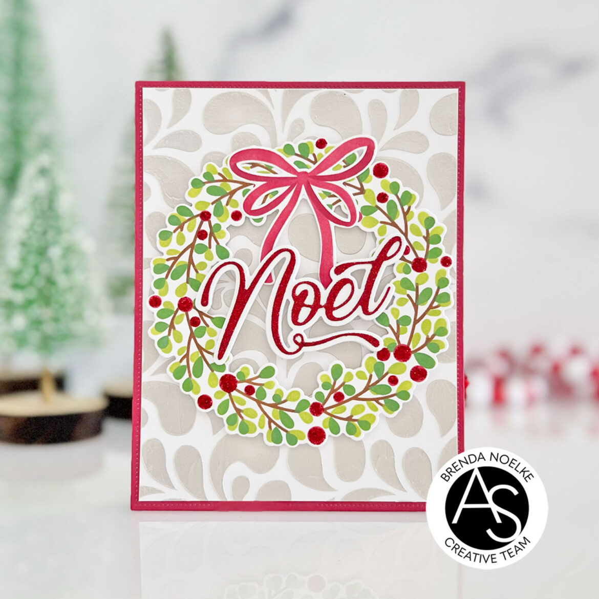 The top layer of sentiment was die-cut from red glitter cardstock and the bottom layer three times from heavyweight white cardstock using the Noel Die Set. I layered and adhered it together with liquid glue, then stretched it across the wreath, adhering it on each end. I added Christmas Red Stickles to the red berries to finish it off.