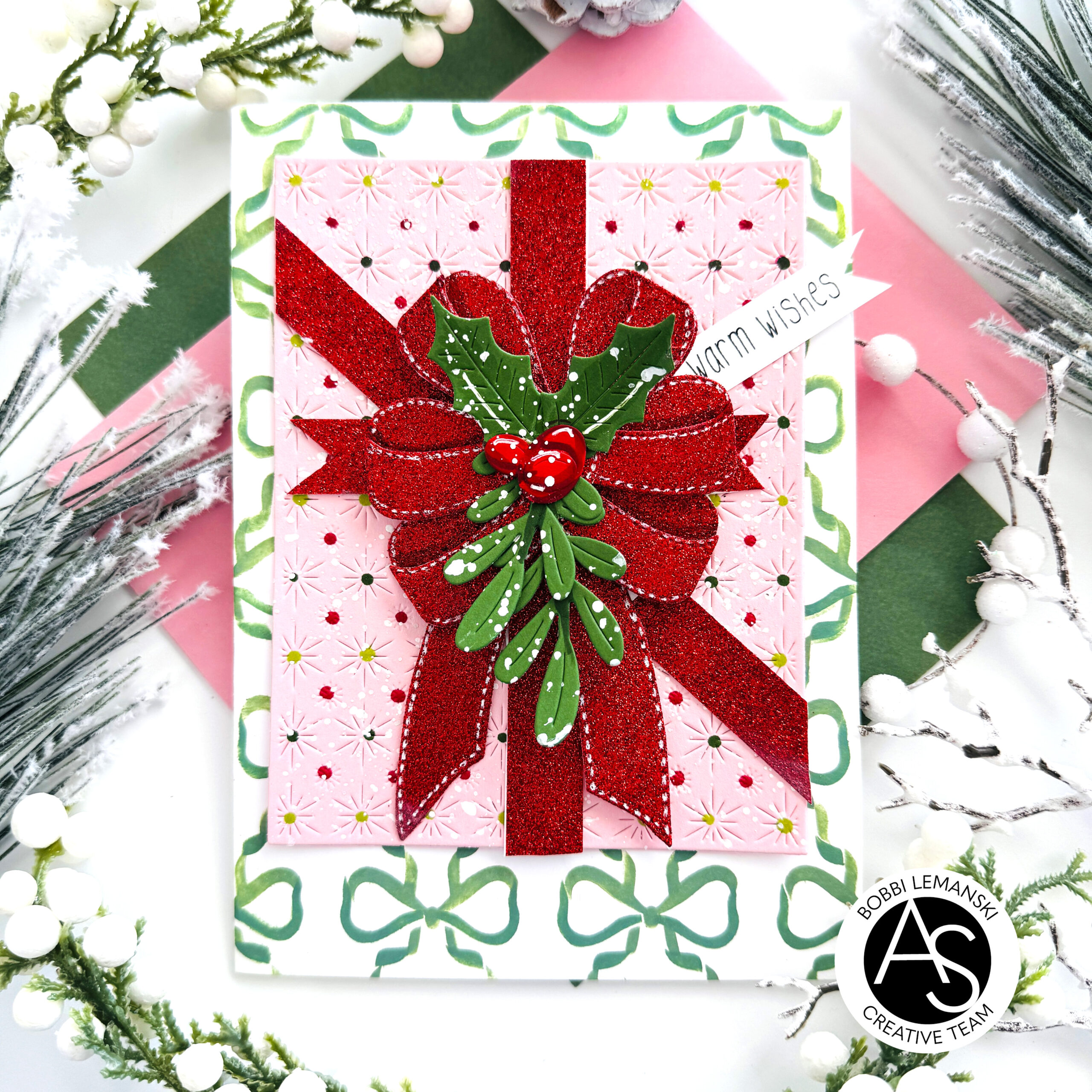 I added two “mistletoe” stems, two holly leaves and three red berries, all from the Christmas Bouquet Die Set to the top of the bow. The leaves and berries were splattered with white paint prior to attaching the greenery to the top of the bow. I glued everything in place.