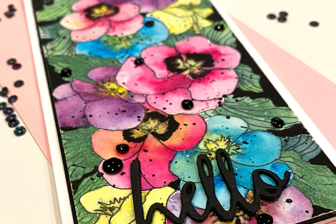 The panel was mounted on black foam mounted on black cardstock the same height as the panel but slightly wider for a narrow ‘side reveal‘. The card base was the same height, 8 1/4 inches, and again slightly wider than the black card stock at 3 1/4 inches. The sentiment, Simon Says Stamp’s Script Hello, was cut from both black card stock and black foam and stacked. The panel was embellished with sequins topped with Nuvo Crystal Drops Ebony Black.
