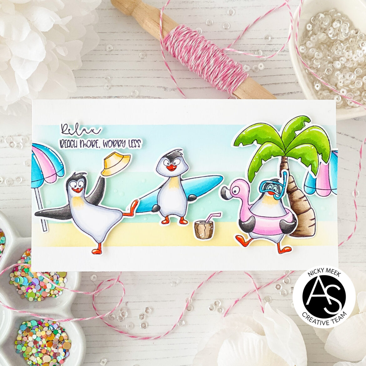 Hello everyone, this is Nicky with you today on the Alex Syberia Designs blog and I’m sharing a mini slimline card that I made in the middle of a snowstorm and it just had me dreaming of a sunny summer beach …. I can’t imagine why!!!!