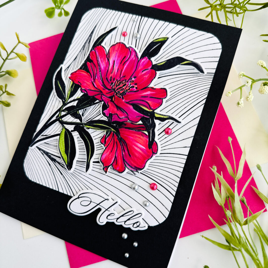 I attached the flower and the “hello” sentiment to the abstract background and added some gem pearl stickers in a metallic silver and fuchsia to the card to add a little bling. This 5″X7″ card is ready to send!