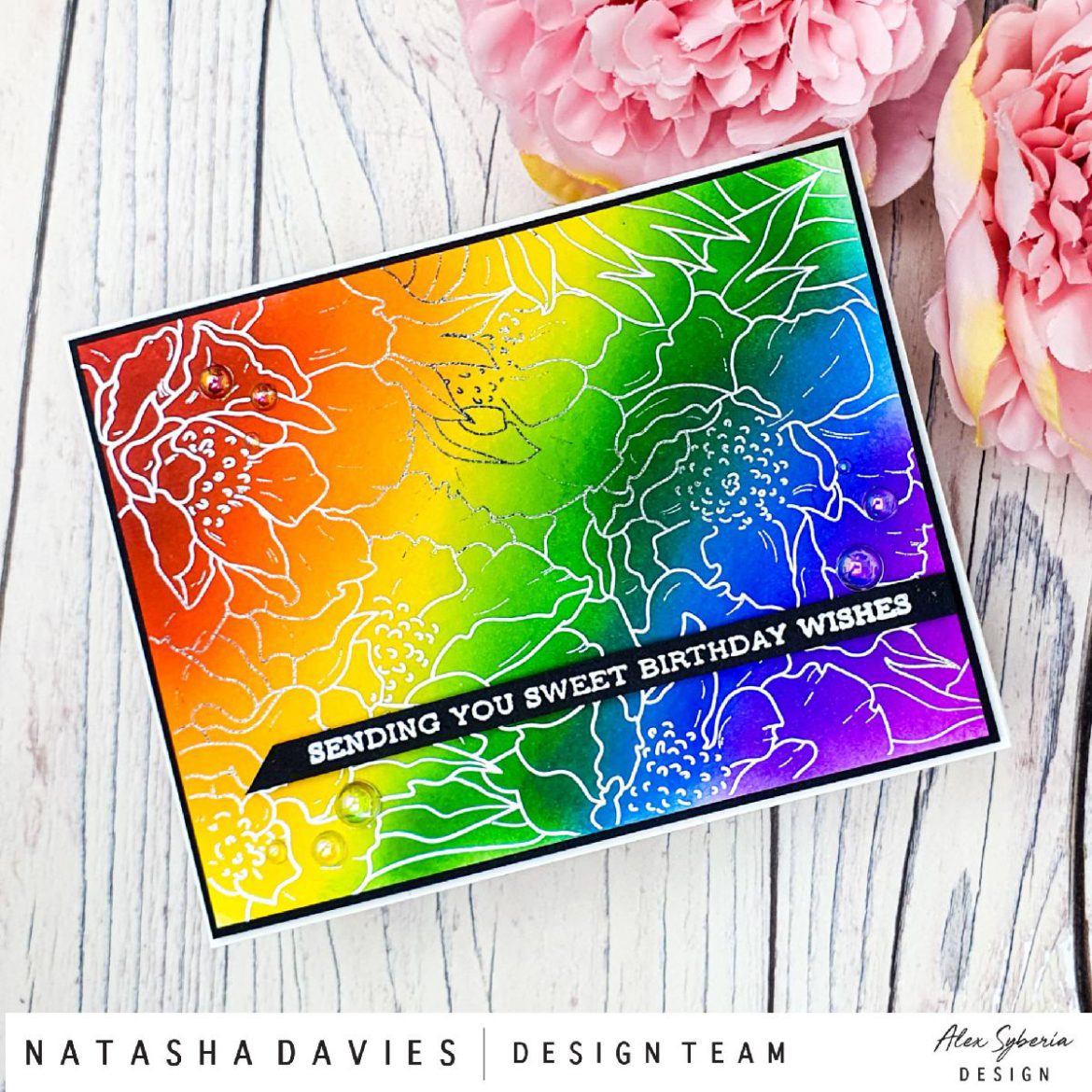 I’m super happy with how this card turned out! It has so many of my absolute FAVOURITE designs elements & techniques; ink blending, rainbows, foiling, embossing, fun embellishments and best of all Alex’s gorgeous floral illustrations!