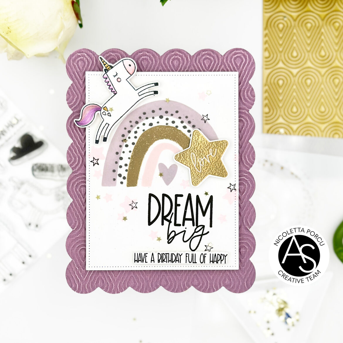 I started die cutting a scallop rectangle from a lilac cardstock using the Nested Scalloped Frames die set , then embossing it using the Glowing Geometry Hot Foil Plate as embossing folder and gluing it over a white cardstock base card. The white base is smaller than the lilac background because I didn’t want it was visible.