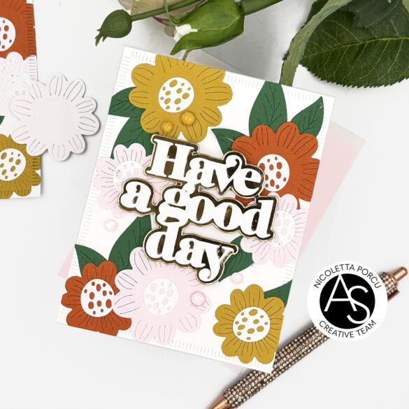 At that point I die cut the big sentiment “Have A Good Day! in white for the top part and in gold for the outlined one, I glued it in the center of the card and as a last thing I added some rain drops.