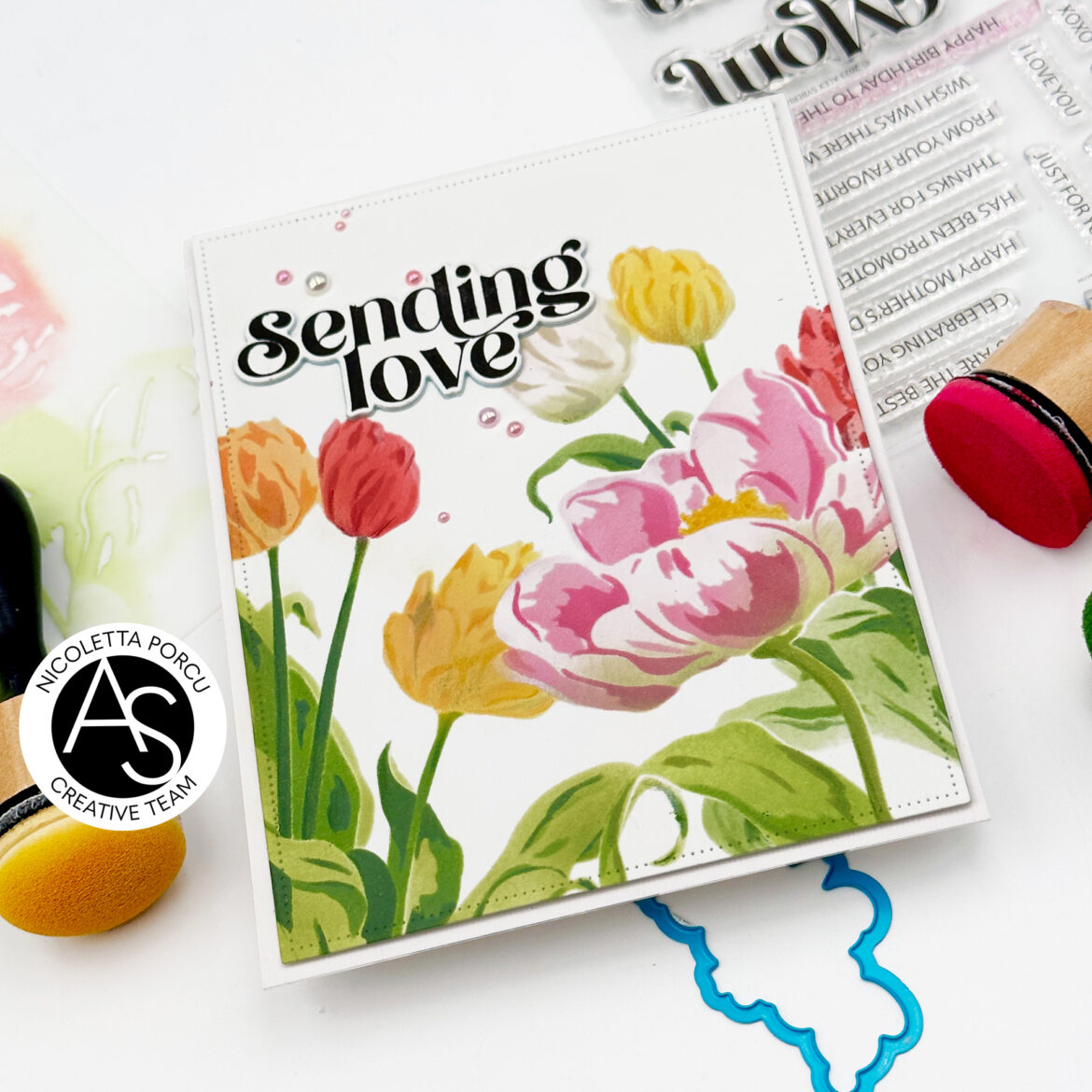 To finish it I simply added the “Sending Love” sentiment I made using “For Her Sentiments” stamp set, and die cutting it with the coordinate die—->For Her Sentiments die cuts.