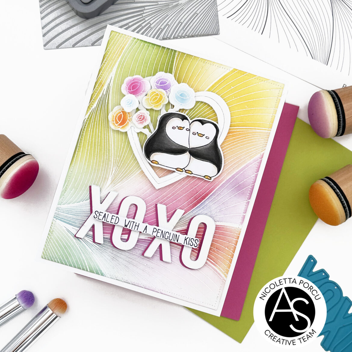 I continued by using the Endless Hearts die to die cut a multi layer white heart to glue in the top center of the card. Over the heart I place two cute penguin and the white embossed roses I stamped and die cut using the Penguin Love Stamp set and his coordinate dies. To color the penguins I used Copic markers and Distress Oxide inks for the roses.