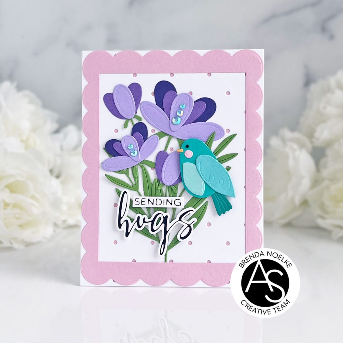 For the background, I die-cut the Tiny Dots Cover Die from white cardstock and layered it over a panel of pink cardstock. I die-cut the frame from the same light pink cardstock using two dies from the Nested Scalloped Frames Die Set and adhered it with liquid glue. The flowers, leaves & bird die-cuts were then adhered, also using liquid glue.