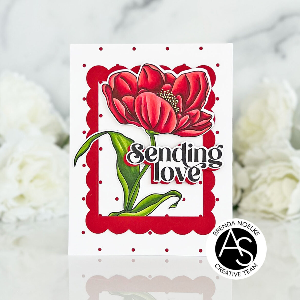 For the background, I die-cut the Tiny Dots Die from white cardstock and layered it over a panel of red cardstock. I also die-cut a frame from red cardstock using two dies from the Nested Scalloped Frames Die Set. The frame and leaves of the tulip were adhered with liquid glue and the tulip bloom was popped up with foam tape.