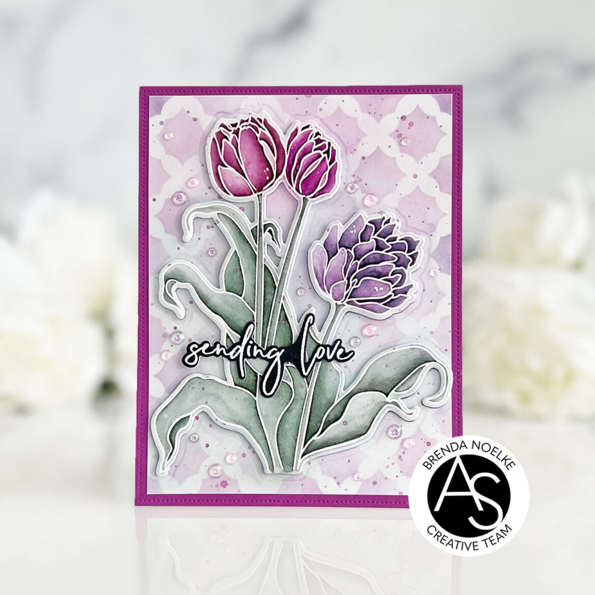 For the background, I chose dye inks that would match my coloring and blended them onto the panel that I cut my tulips from using the Floral Lattice Stencil. I also splattered the panel with diluted dye inks in the same colors. The panel was trimmed slightly and adhered to a plum panel that was die-cut with the largest die in the Nested Scalloped Frames Die Set. The stacked die-cuts were inlaid into the background.