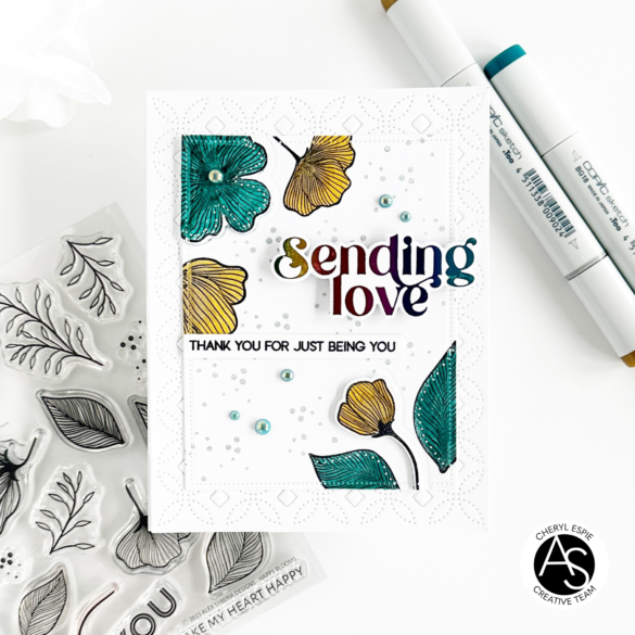 I have to say, that I think the teal and gold effect of the Copics really made the Happy Blooms set pop on that white backdrop.