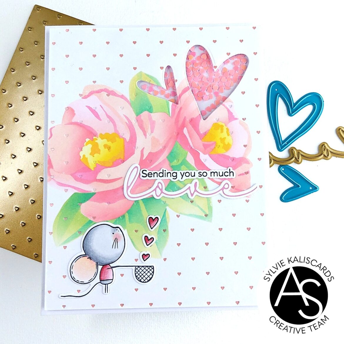 I have a cute love card today with the Heartfelt blooms layering stencils, a cute mouse chasing hearts from the Sweet friend stamp set, the Quirky hearts die set which I used to create openings for a shaker, a small sentiment from the Beautiful day stamp set, Love hot foil plate and coordinating die set and finally, in the background, the Tiny hearts hot foil plate