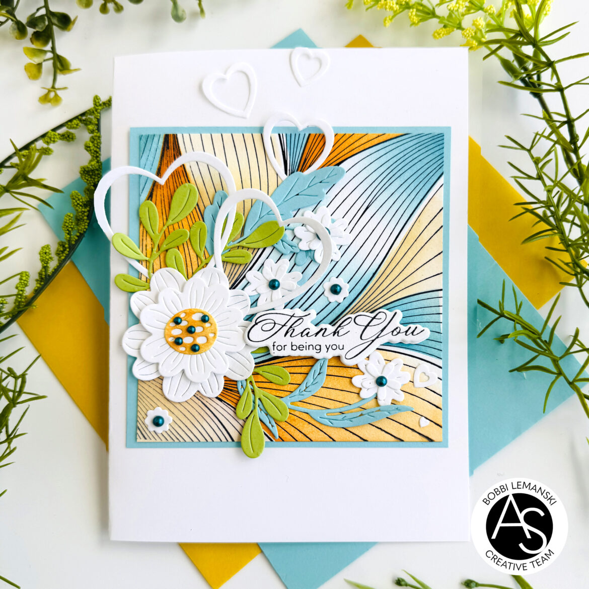 I die cut the flowers and leaves using the Andalusia Wildflowers Die Set. I also cut five nested hearts from the Endless Hearts Die Set. I added teal pearl gem stickers to the centers of the white blossoms. I attached the florals, greenery and hearts to the background, allowing the two smallest hearts of the five to extend beyond the matted background design. Lastly, I die cut the Classic Sentiments using the coordinating die. I attached the “thank you” to the front using foam tabs to make it stand out.