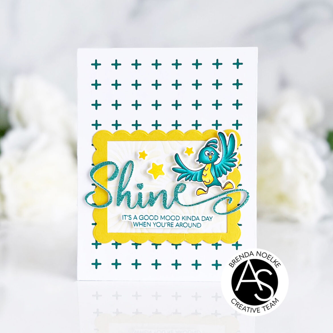 “Shine” was die-cut from teal glitter cardstock once and heavyweight white cardstock three times using the Bright & Bubbly Die Set. All of the layers were stacked and adhered together and added to the front of the card. All of the other die-cuts were popped up with foam tape and I was finished.