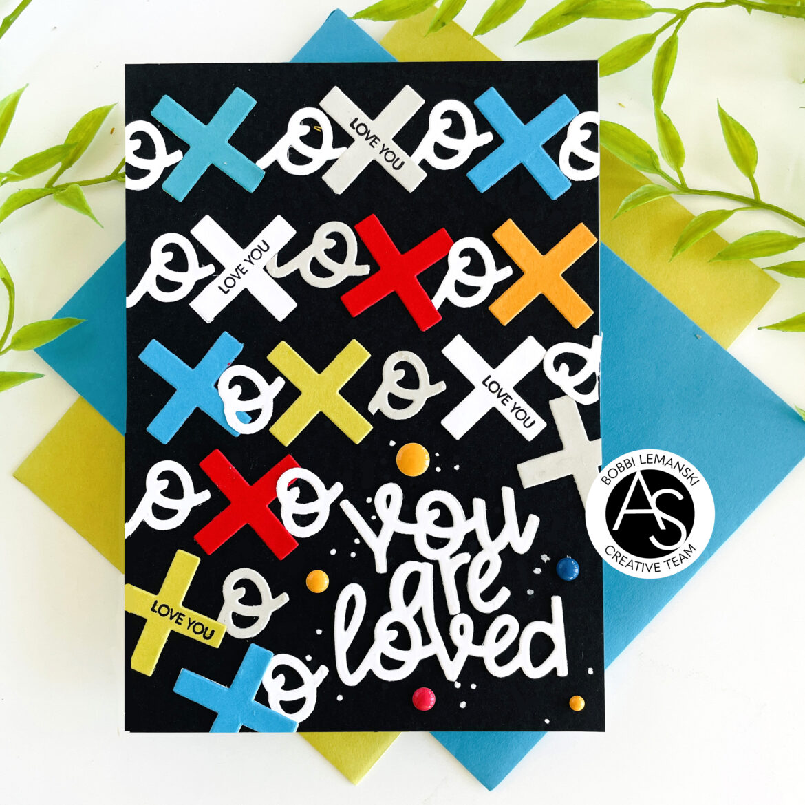 This card says it all. You are loved… over and over and over again! Show me the love! It’s Bobbi Lemanski here with a card with a strong message in high, impactful, contrast colors. This black background card makes the Xs and Os plus the sentiment in the lower right corner, stand out in a fun way.