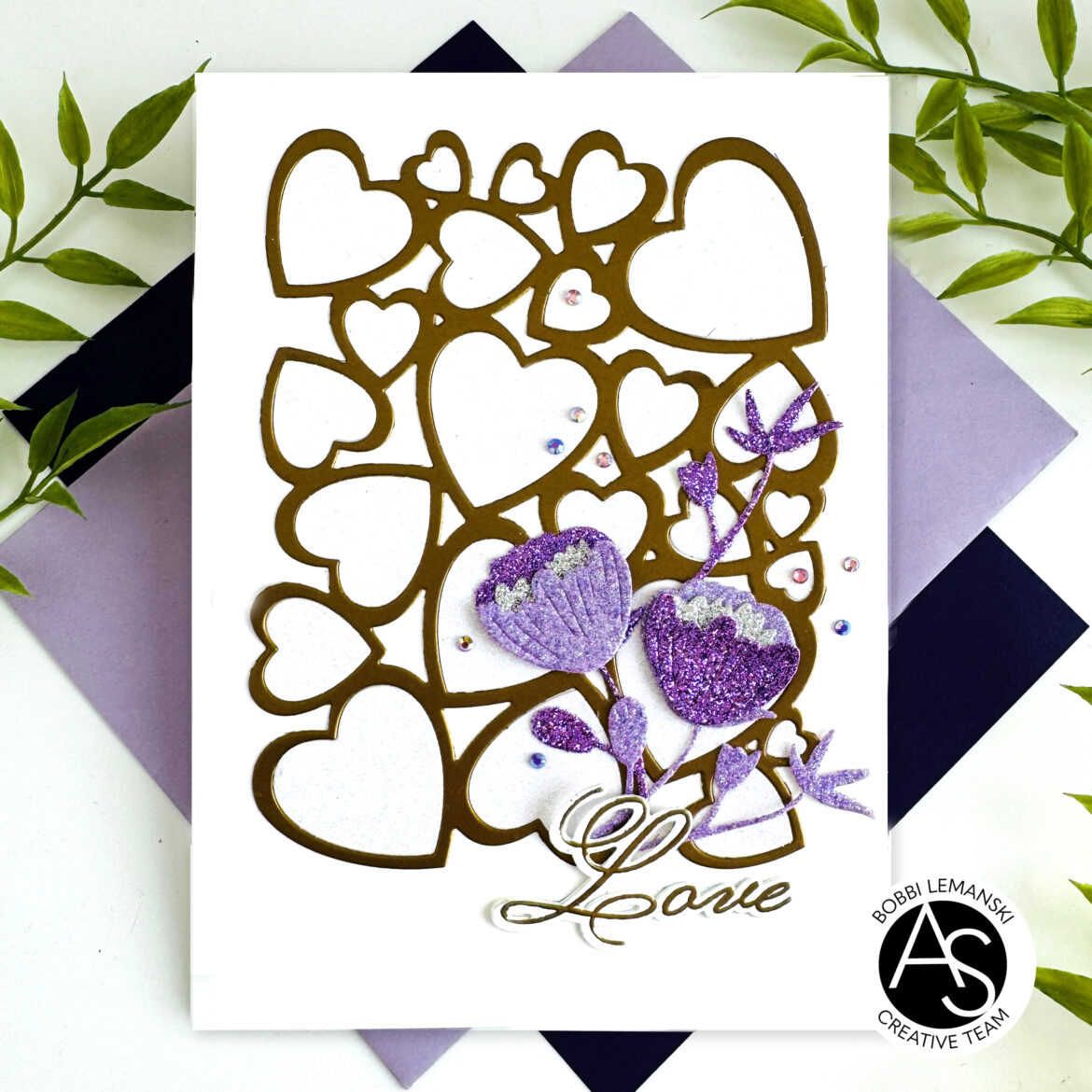I die cut the flowers from glittery lavender, purple and silver cardstock using the Trendy Botanicals die set. I attached the flowers to the card front in the lower right. Below the flowers, I stamped, embossed and die cut the scripted “love” word using the From Our Hearts stamps and coordinating dies and gold embossing powder. I attached the “love” word right below the flowers on the card front using foam tabs to make it stand out. Lastly, I added some more sparkle using self-adhesive gem stickers in purples to complete the card. This card could be used for a wedding, anniversary or engagement event. It’s fast, simple to make and offers so much sparkle and glam to elevate its design!