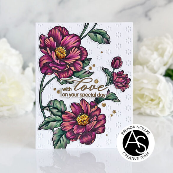 I began by stamping the stunning floral image from the Spring Garden Stamp Set onto white cardstock with Copic-friendly black ink. I colored it with Copic markers, added dots to the centers of the flowers with a yellow gel pen, then cut it out with the Coordinating Die.