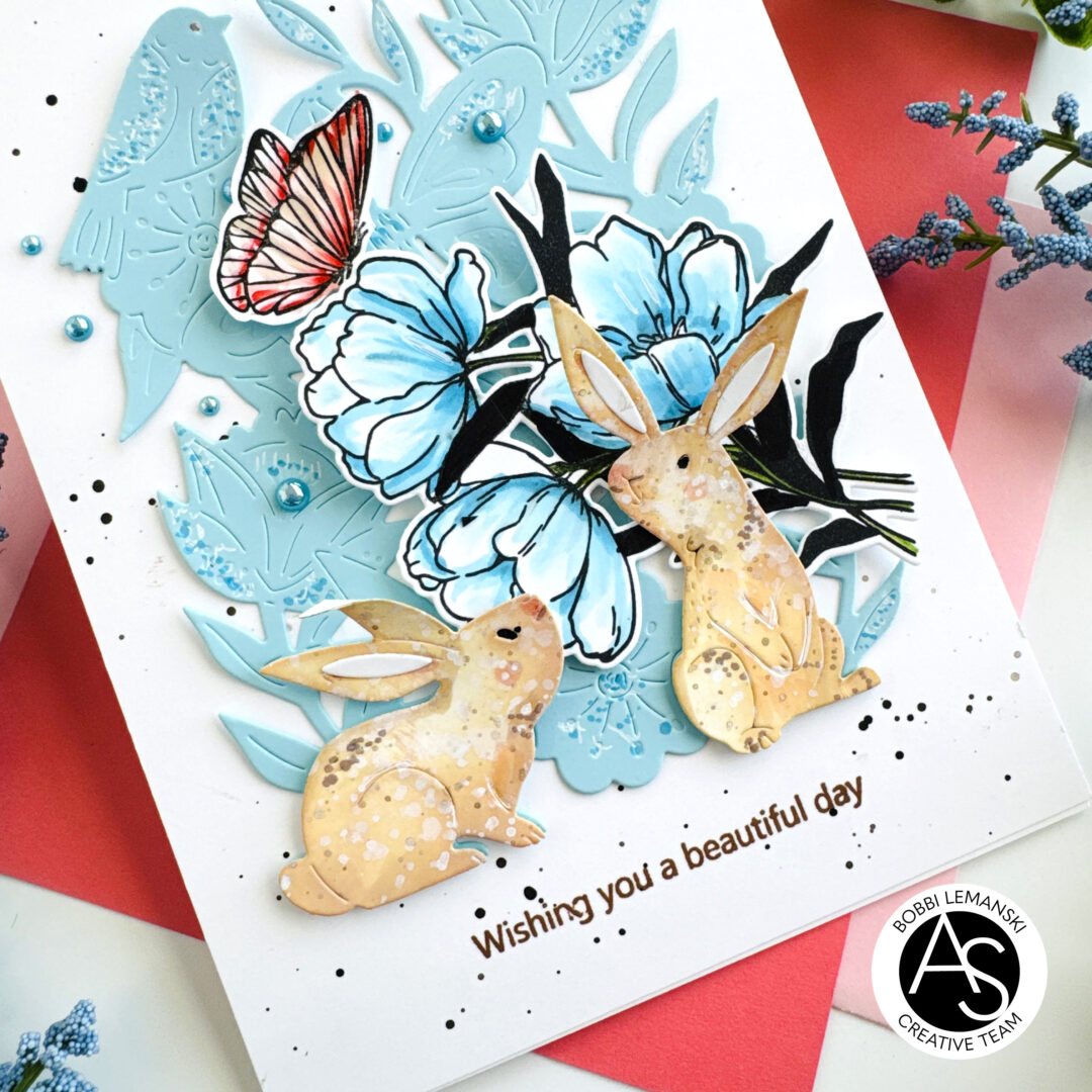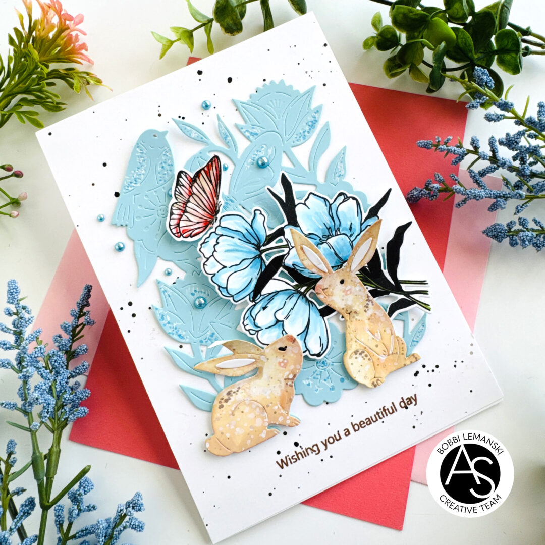 I splattered the card base with black watercolor ink for an organic background. To assemble the card, I attached the blue die cut background to the card base. I stamped a sentiment to the bottom from the “Tulips in Bloom” stamp set using brown ink. Attached the tulips florals, bunnies and butterfly using foam tabs to make them stand out from the background. Lastly, I added a few aqua blue pearl gem stickers to complete the card.