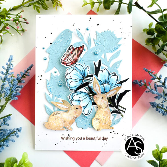 I splattered the card base with black watercolor ink for an organic background. To assemble the card, I attached the blue die cut background to the card base. I stamped a sentiment to the bottom from the “Tulips in Bloom” stamp set using brown ink. Attached the tulips florals, bunnies and butterfly using foam tabs to make them stand out from the background. Lastly, I added a few aqua blue pearl gem stickers to complete the card.
