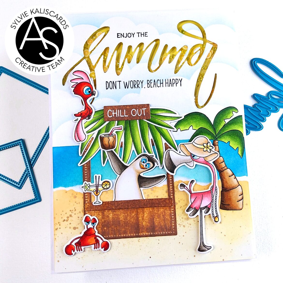 I then assembled the Tiki-bar adhereing the leaves at the top and covering the top edge with the Chill-out sentiment. I also added the thin rectangle at the bottom of the rectangle opening to create the bar counter. I then adhered the penguin’s feet behind the bar and glued the drinks. Once done, I adhered the Tiki-bar on my front panel with liquid adhesive. I then adhered the parrot with foam tape at the top and liquid adhesive behind the tail. I also adhered the crab with foam tape and liquid adhesive. Finally, I adhered the flamingo with foam tape.