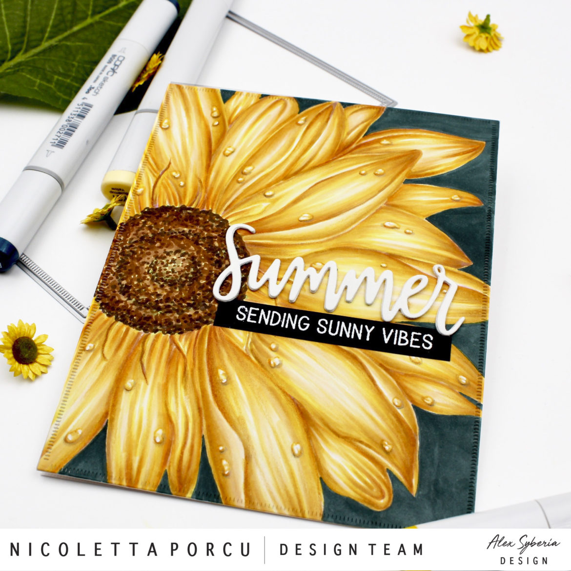 After colored everything I die cut the image using a Moda Scrap rectangle die and at the end I added the sentiment. The Summer die is by Neat and Tangled and the black stripe is made embossing in white a MFT stamp