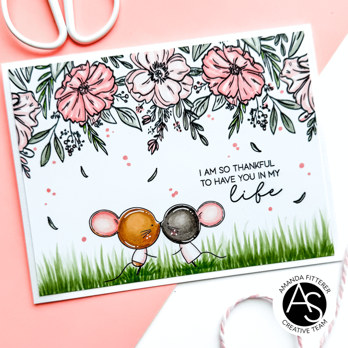 To create this card, I trimmed a white piece of cardstock to 4″x5.25″. I stamped the mice and the flowers with black ink directly onto this piece of cardstock. I also stamped my sentiment!