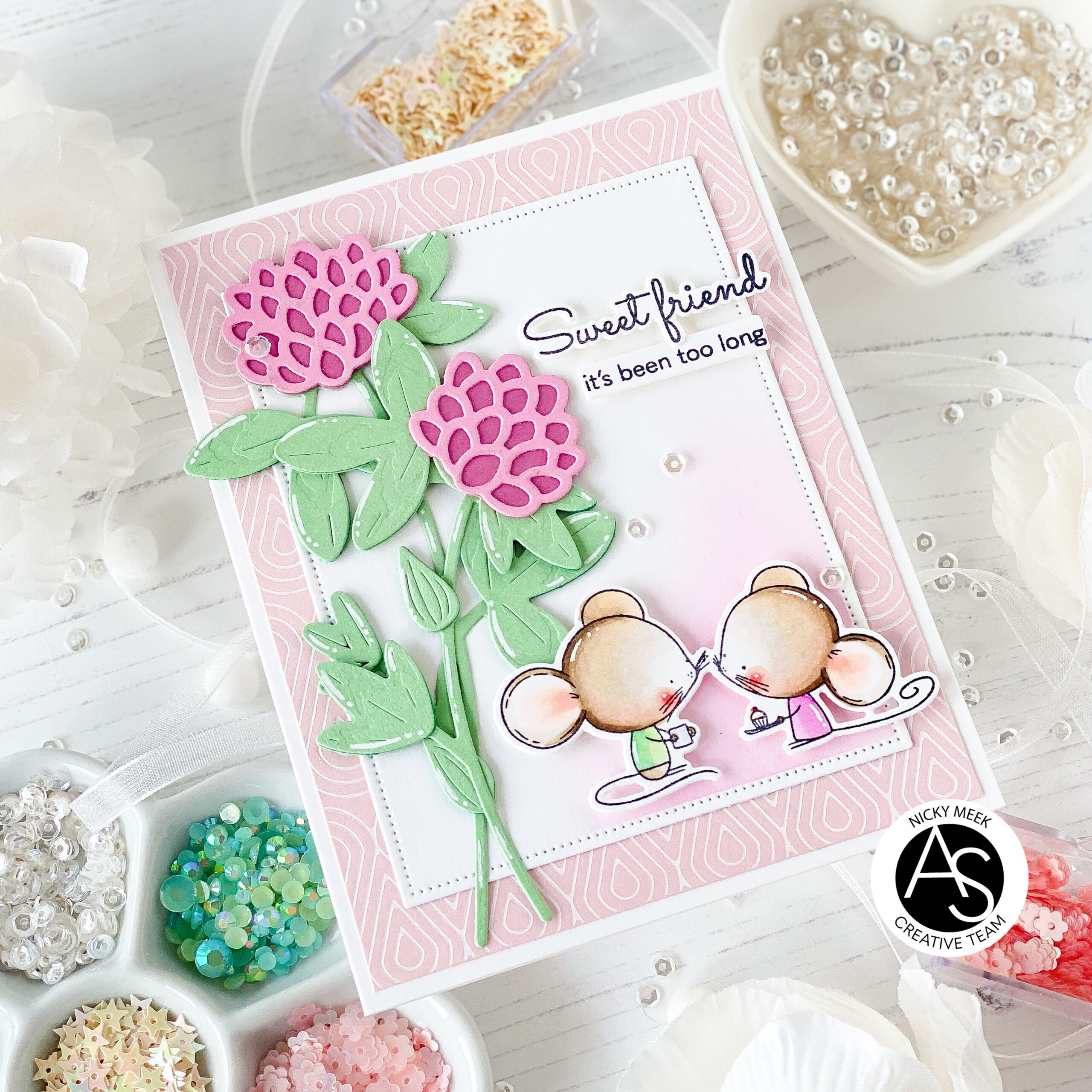 I using green and two shades of pink cardstock, I die cut the clover using the Spring Clover Die Set. I glued the pieces together and adhered the flowers to the background.
