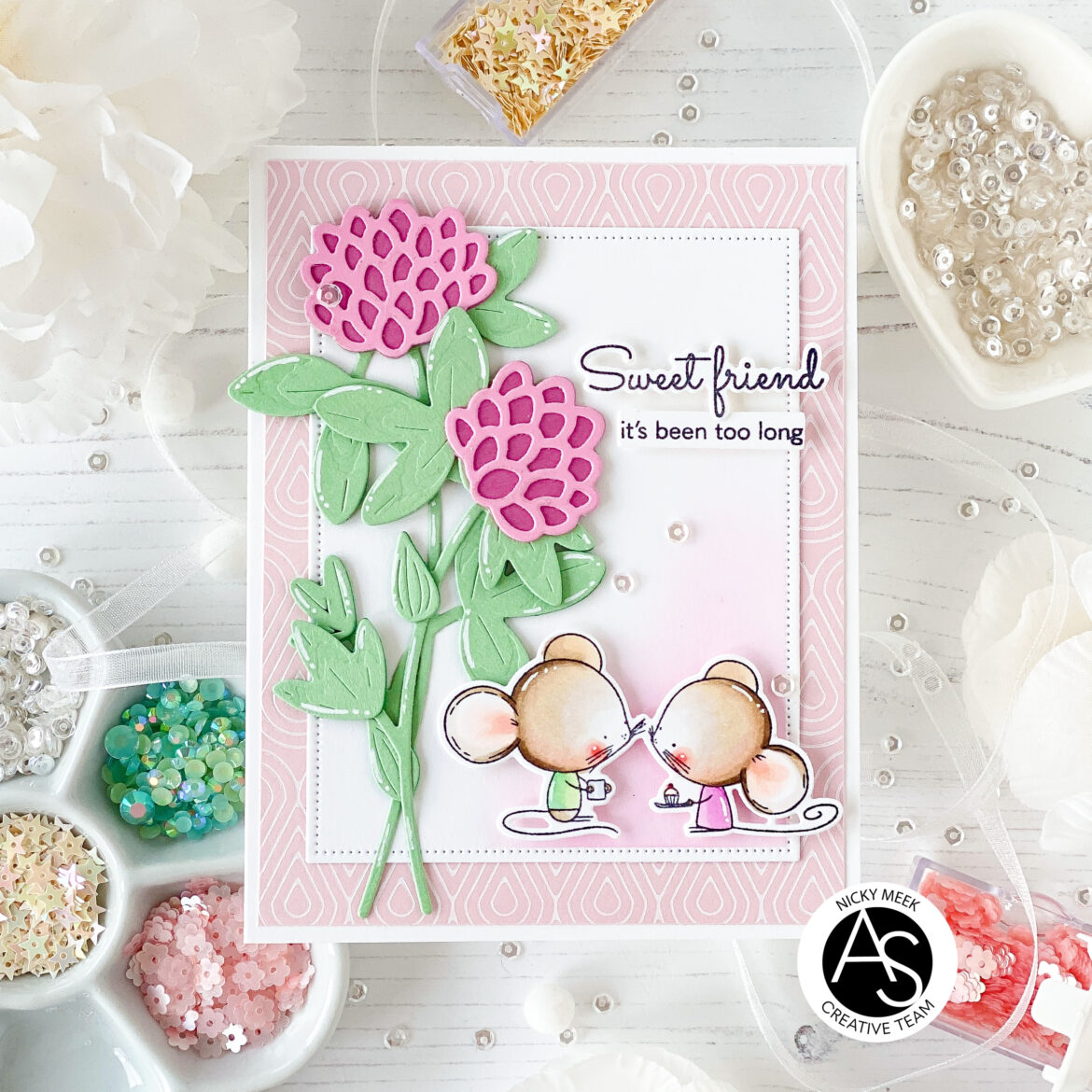 I using green and two shades of pink cardstock, I die cut the clover using the Spring Clover Die Set. I glued the pieces together and adhered the flowers to the background.