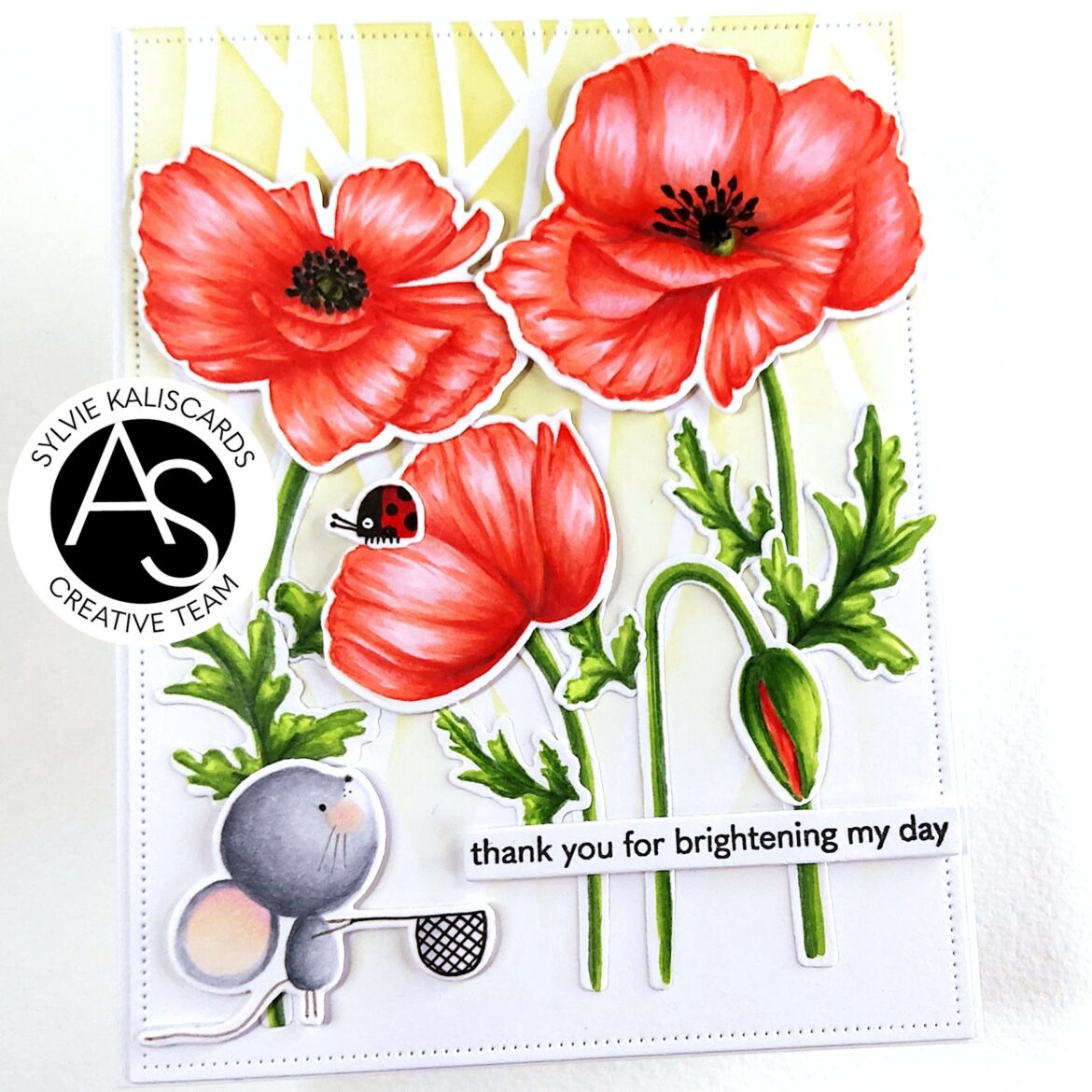 To create this card, I stamped the poppies from the Cindy Lou’s poppies set, the lady bug from the Cheerful Panda Moments set and the mouse from the Sweet friend set, with a light ink. I then colored all the images with Copic markers. I used grey and black Copic liners to add details to the ladybug and mouse.