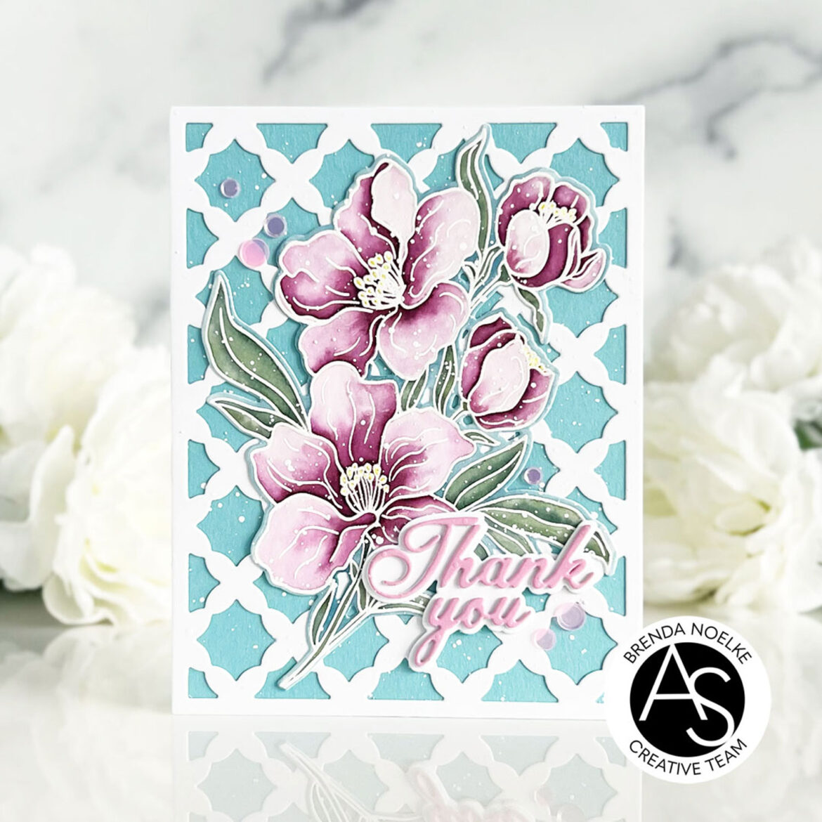 For the background, I die-cut the Floral Lattice Cover Die from white cardstock and adhered it to a panel of aqua cardstock. (Sorry, I just realized that this cover die must have been discontinued.) The floral die-cut was adhered using liquid glue and the panel was splattered with diluted white bleed-proof ink and set aside to dry.