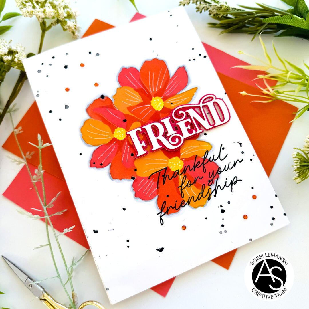 To make this card, I used the Minimalist Flowers Stencil Set, blender brushes, and Distress Oxide Inks to stencil the flowers on the white cardstock. I used three orange-colored ink colors to create the varied petal look. This bouquet could be stenciled in any color, including your bestie’s favorite colors! After stenciling the design, I splattered a little watercolor ink over the card front using Kuretake Gansai Tambi ink and a fan-shaped brush. I splattered a few spots on the petals, too.
