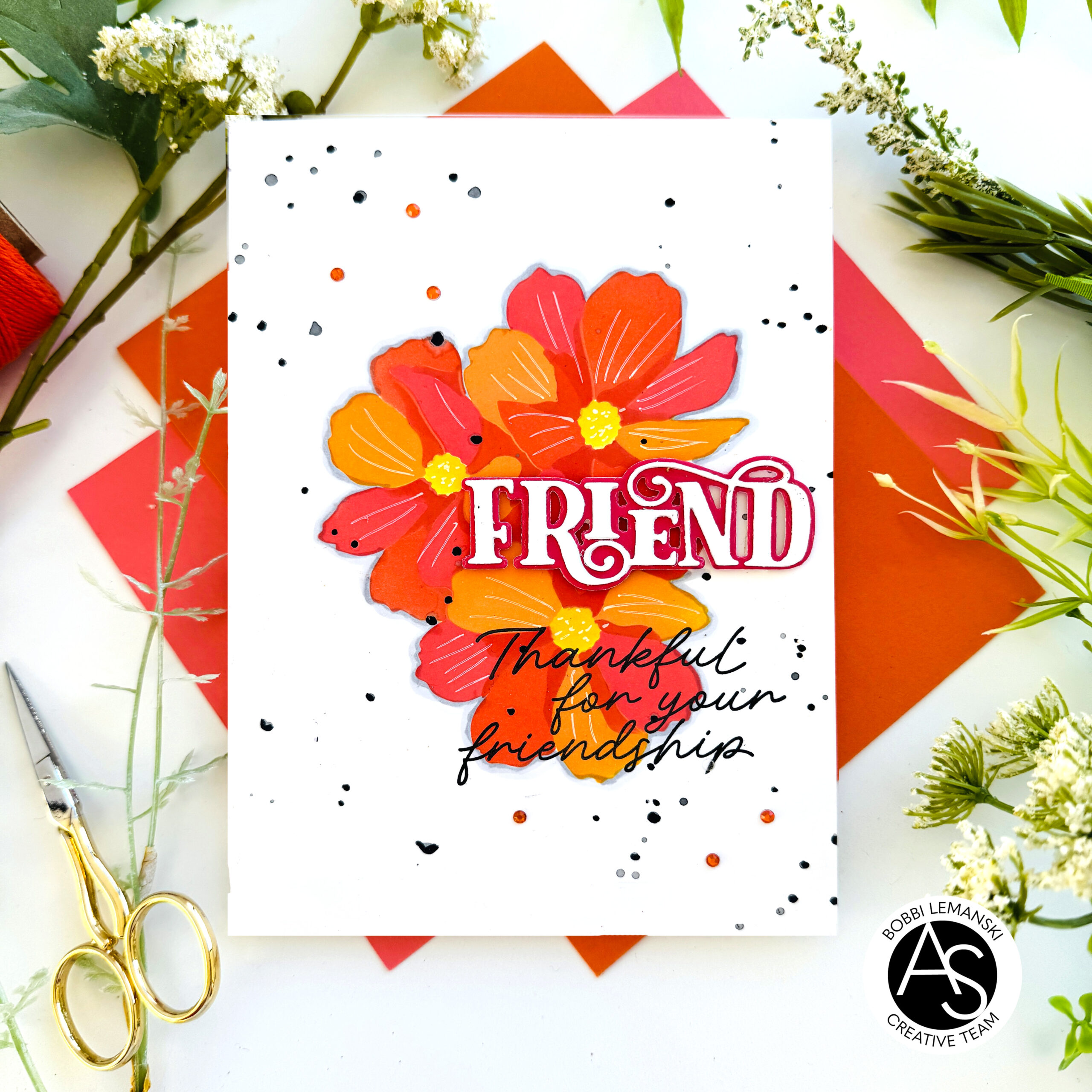 To make this card, I used the Minimalist Flowers Stencil Set, blender brushes, and Distress Oxide Inks to stencil the flowers on the white cardstock. I used three orange-colored ink colors to create the varied petal look. This bouquet could be stenciled in any color, including your bestie’s favorite colors! After stenciling the design, I splattered a little watercolor ink over the card front using Kuretake Gansai Tambi ink and a fan-shaped brush. I splattered a few spots on the petals, too.