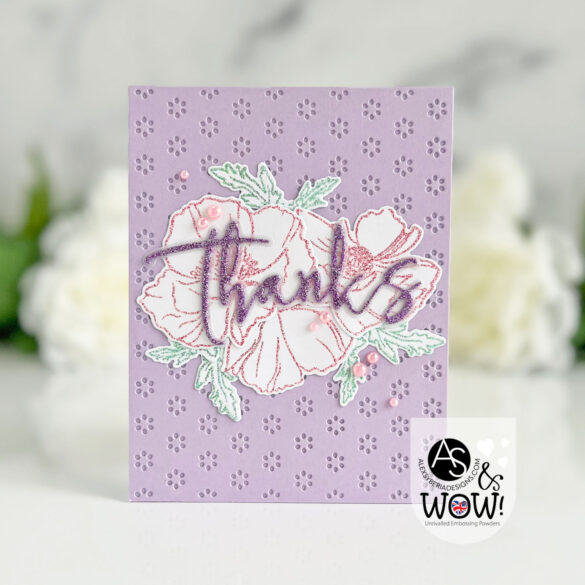 The top layer of the Large Thanks Die was cut from white cardstock, coated with embossing ink and embossed with Grape Fizz Embossing Powder, also from the Twinkly Fizz Collection. I repeated the process three times to build up the thickness of the embossing powder. The bottom layer was cut from vellum, then they were layered and adhered over the flowers. I added a few pink pearls to finish it off.