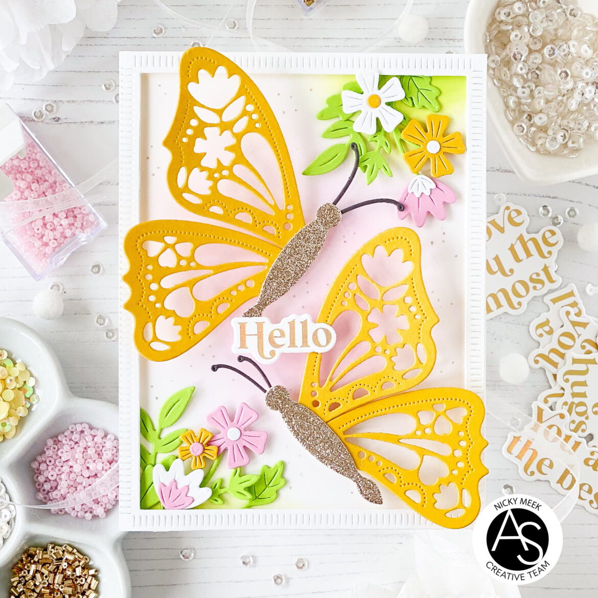 I found some pink, white, green, yellow and glittered gold cardstock in my stash of leftovers from other projects and I die cut the butterflies parts and the flowers and greenery. I adhered the pieces together and then adhered them with foam tape to the ink blended background. The butterflies are on a double layer of foam tape under their glittered bodies so that they really elevated and the light really gets underneath them.
