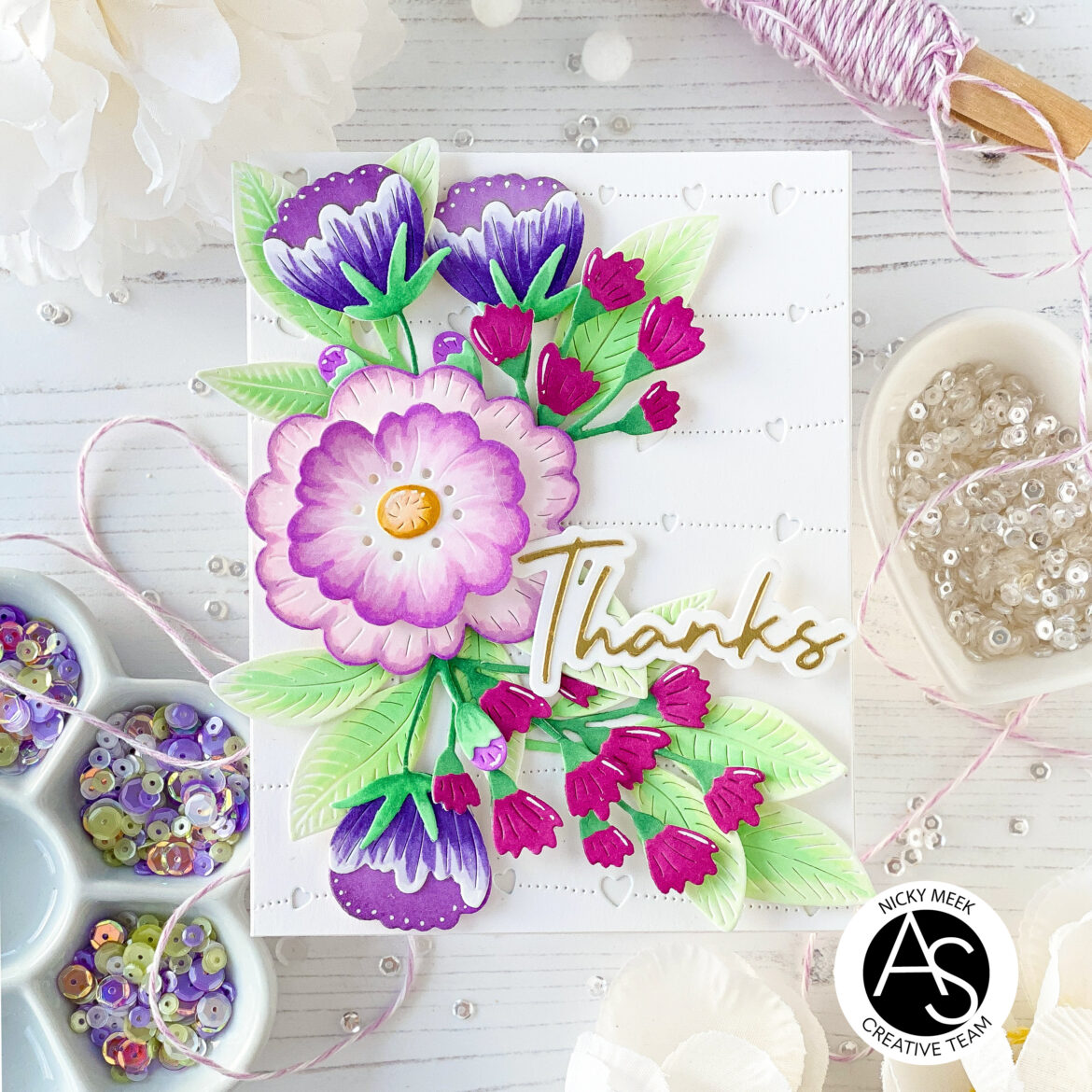 For the finishing touch I die cut the word Thanks from white and gold cardstock, glued the two parts together and then using tiny pieces of foam tape I floated the sentiment above the blooms.