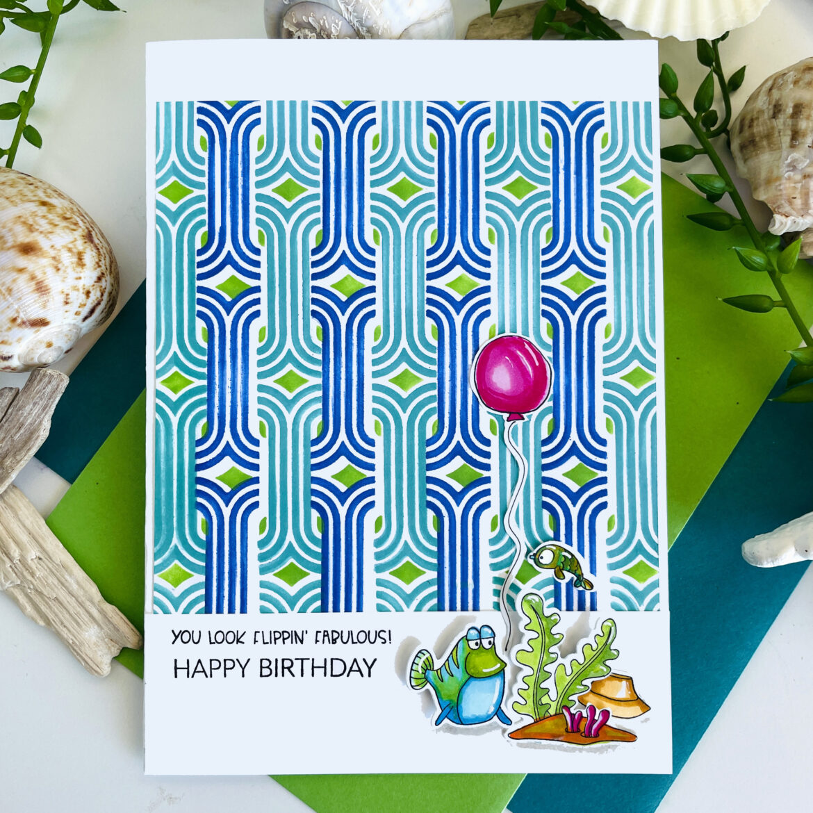 I added a wider strip of white (2″) at the bottom of the card and stamped two sentiments, one from the Rainbow Sentiments stamp set and one sentiment from the Underwater Wonders stamp set. I attached the colored images using foam tabs for the fish and underwater plants mound. The flipping fish and hat were attached with glue. Lastly, I hand drew a balloon and string and colored it in fuchsia and cut it out by hand. I attached it over the stencil design to unite the mini corner scene with the modern background pattern.