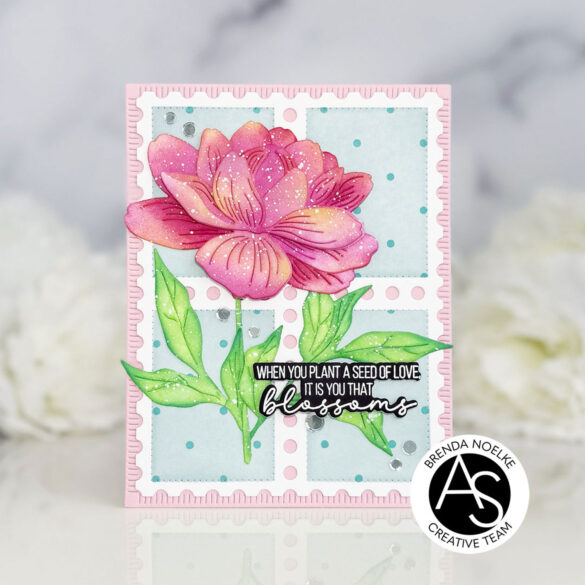 For the background, I die-cut the Postage Stamps Cover Die from white cardstock. I placed the Postage Stamps Stencil over it and blended aqua dye ink into the openings and left the stencil in place once I was finished. The Tiny Dots Stencil was placed over the Postage Stencil and darker aqua ink was blended over it before removing both stencils. A panel of pink cardstock was die-cut with the largest die in the Good Day Quilted Rectangle Die Set and the postage die-cut was adhered with liquid glue. The peony die-cuts were layered and adhered together using liquid glue, then adhered to the front of the card.