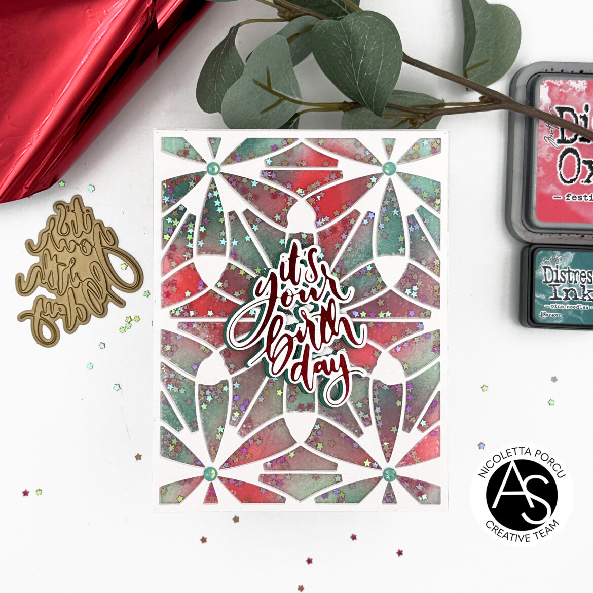 I continued by die cutting the top panel of my card using the Snowflake Petals Cover die in 4 layers… I adhered the first 3 together, then I glued an acetate sheet and over the last snowflake petal layer and I put white glitters red stars confetti into the petal’s shakers.
