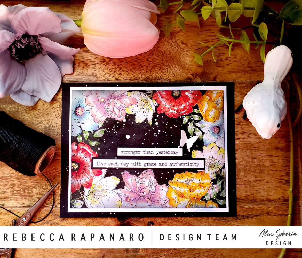 I adhered my image panel to a piece of Alex’s Mixed Media Pattern Paper from Maker Forte and the adhered both panels to my A2 sized black card stock card base.