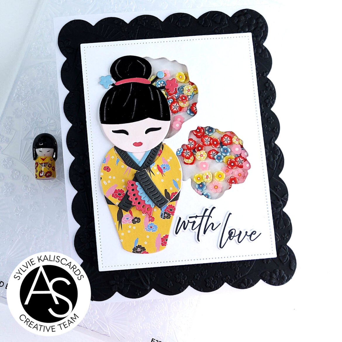 To assemble the card, I adhered the background panel onto the cardbase with liquid adhesive. I then adhered the shaker in the center with liquid adhesive. I then glued the kokeshi doll and finally the sentiment which I stamped with black ink on white cardstock, using the Avian allure stamp and coordinating die sets.