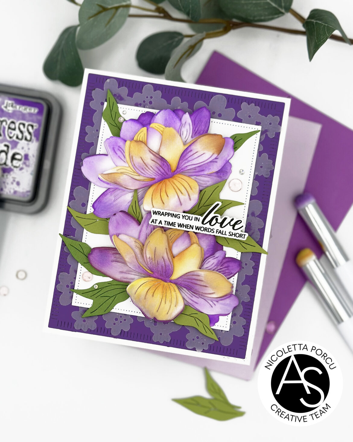 To make my card I started by die cutting twice all the parts from the Elegant Peony die set. The petals in white cardstock and the leaves in two shades of green. I colored the white ones using Distress Oxide inks and some touch of Prismacolor pencils and as I finished I assembled the two peonies.