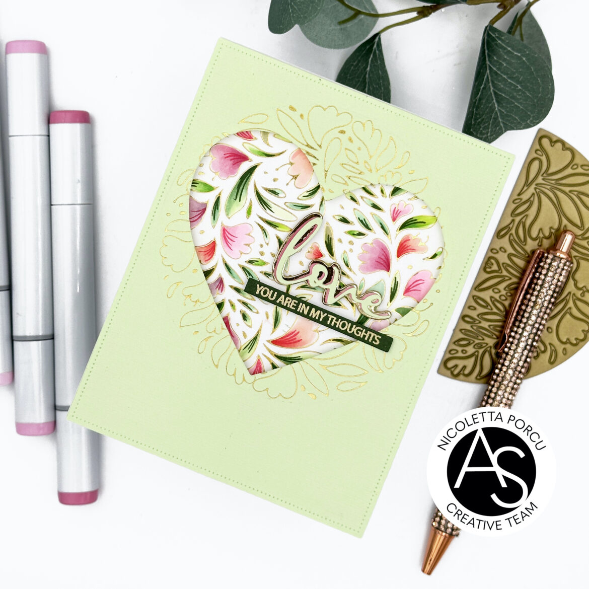 Next up I die cut a dotted rectangle from the green cardstock using Nested Scalloped Framed dies set and I continued by cutting out a hert shape from the hot foiled part.