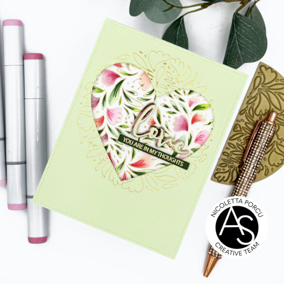 I die cut the love word using the Love and Hugs die set. The outlined part in metallic gold cardstock and the top one in two layers (pink and green) I glued lightly staggered.