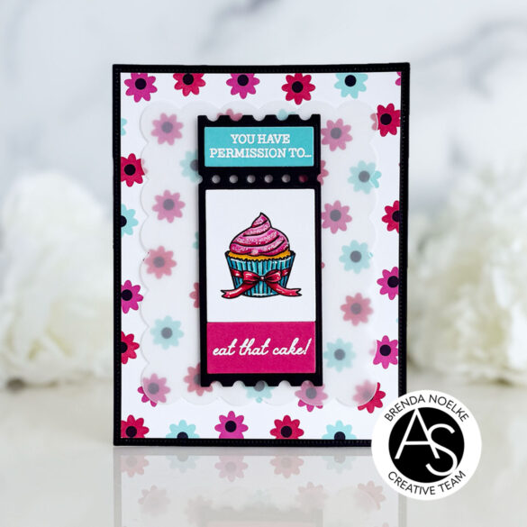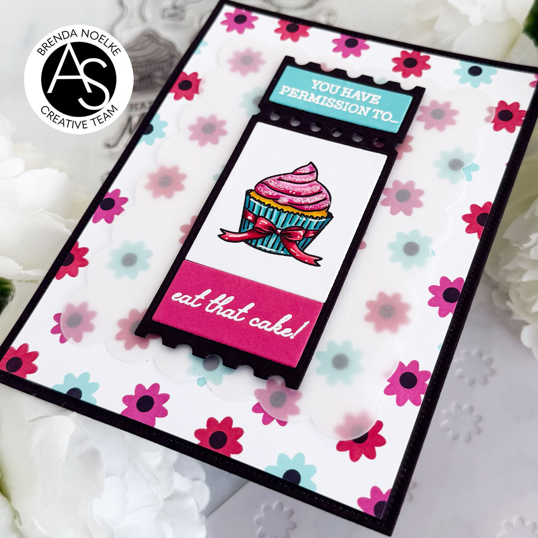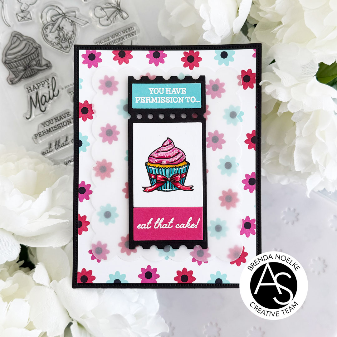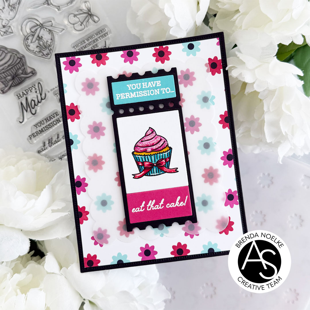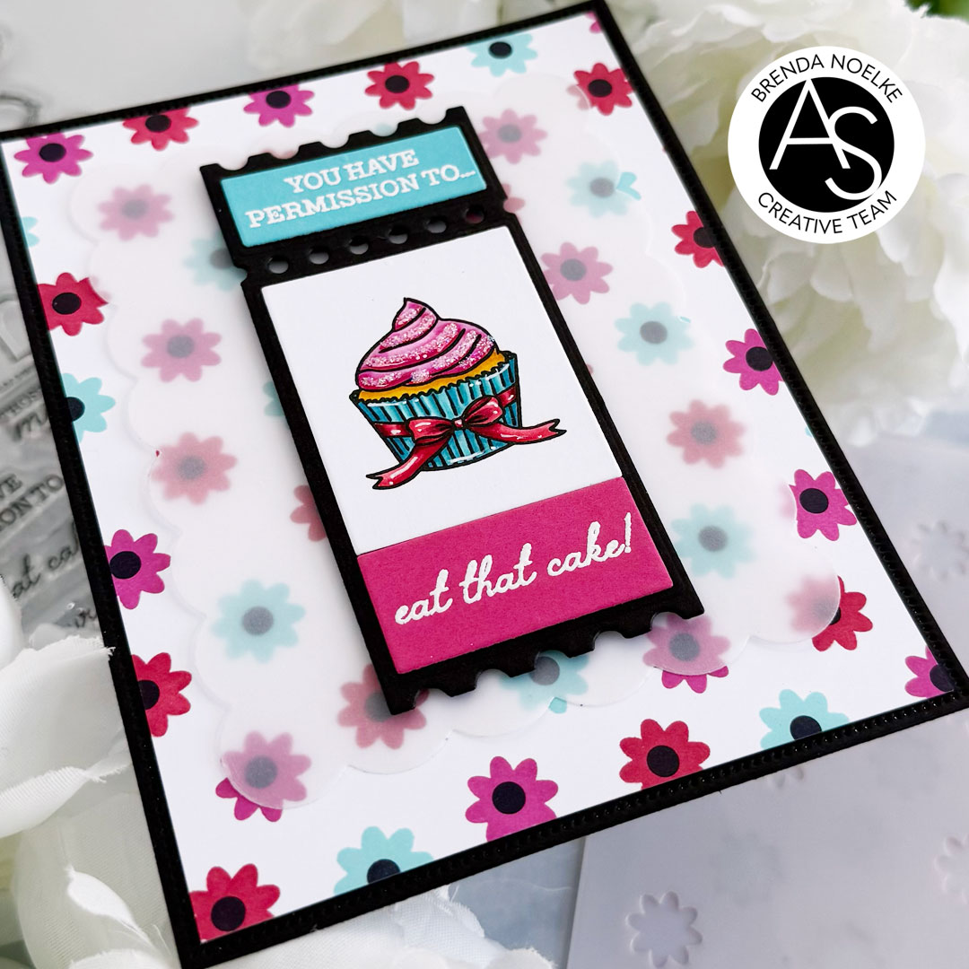 The second largest scalloped rectangle die in the Nested Scalloped Frames Die Set was cut from vellum. It was adhered to the floral background with liquid glue, placing the glue only in the center of the vellum panel. The ticket was adhered with foam tape. I added some Star Dust Stickles to the frosting on the cupcake to add a bit of sparkle and finish off the card.