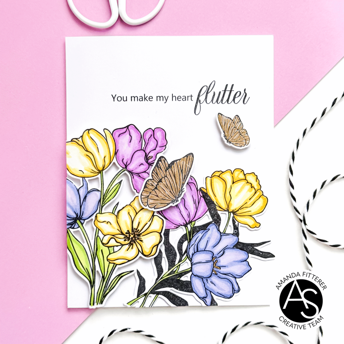 To create this card, I stamped the flowers and butterflies from the Tulips in Bloom Stamps and then colored them with Copic markers.